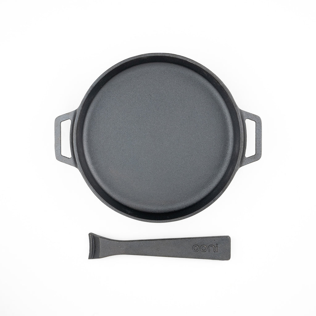 Our premium cast iron Ooni Skillet is perfect for cooking meat, seafood, vegetables and much more in your Ooni pizza oven. The Ooni Skillet comes with a custom-designed removable cast iron handle making it easy to get sizzling hot food straight from your oven to the table, and a stainless steel trivet stand for serving.