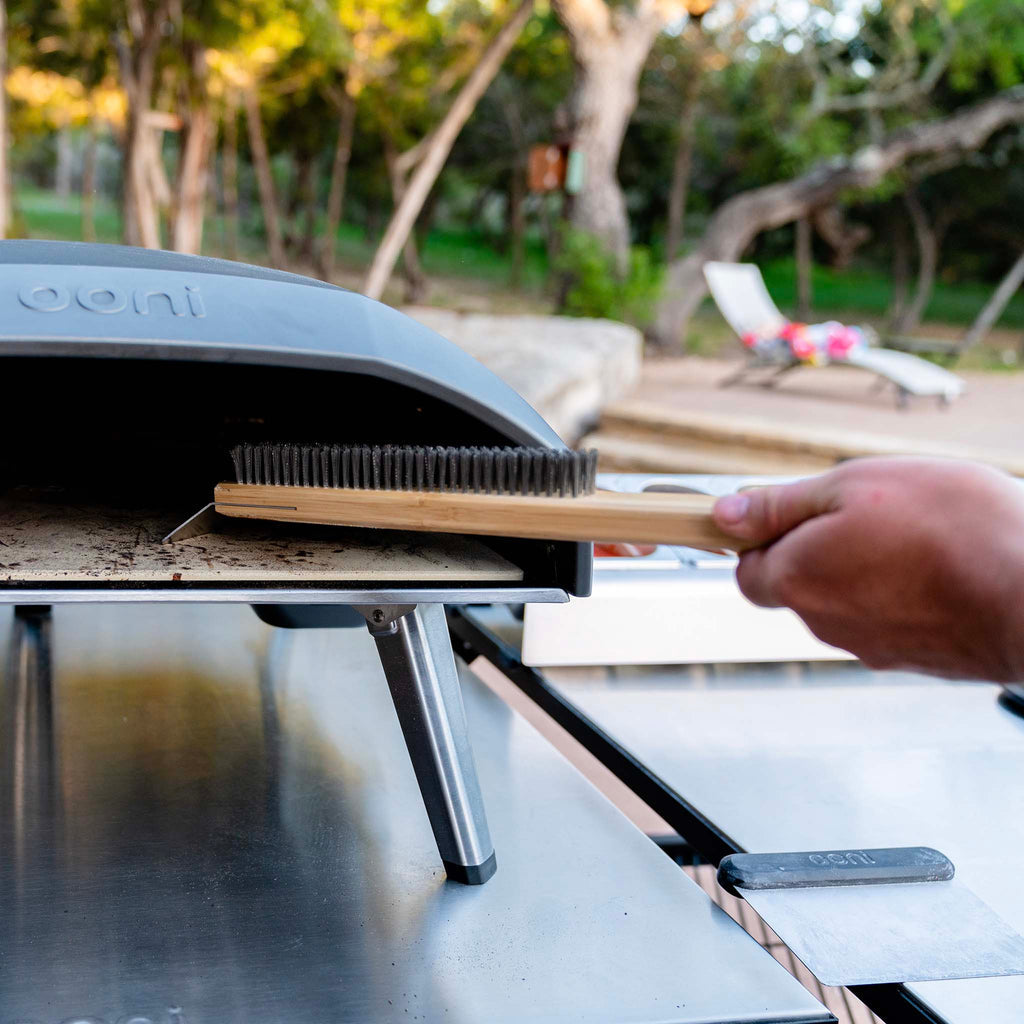 The Ooni Pizza Oven Brush is a 2-in-1 stone baking board brush and scraper tool featuring a comfortable wooden handle, plus a durable stainless steel scraper and bristles. The perfect tool for efficiently and quickly cleaning your Ooni baking stone after cooking, brush off excess flour with the bristles, then flip to scrape away fallen food.